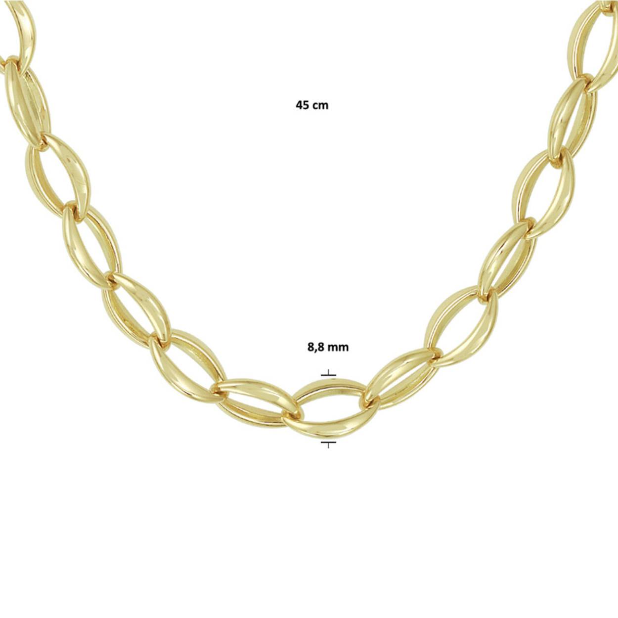 Geelgouden anker collier met een draaglengte van 45cm en een schakelbreedte van 8.8mm. Het collier heeft een poli afwerking en is uitgevoerd met een stevige karabijn sluiting. Draag het collier samen met het bijpassende collier.