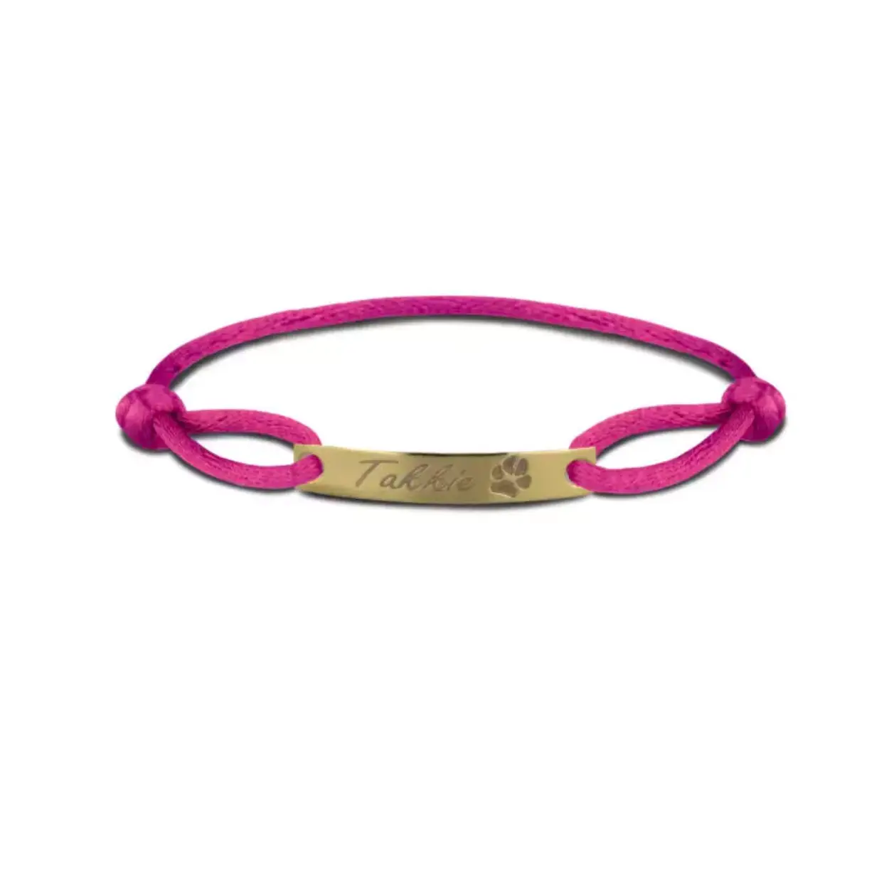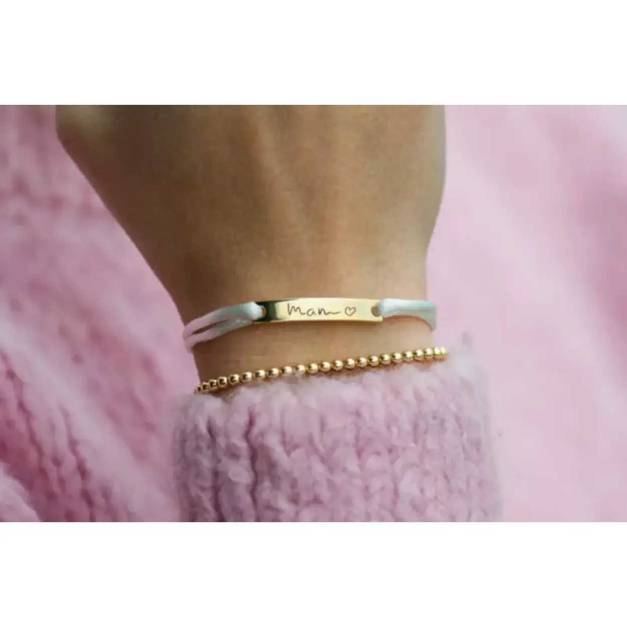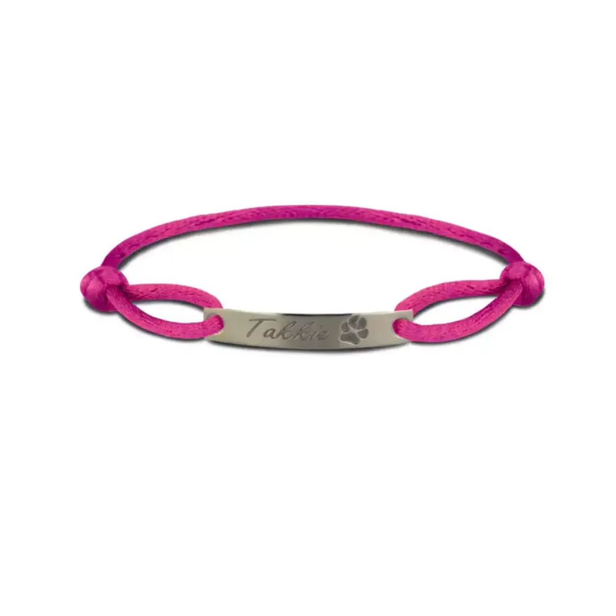 Satijn/ Zilveren armband met zilveren oval disk. Op deze disk is een laser gravure mogelijk.  Kleuren van de satijnen bandjes staan op de foto. Of u een geboorte, graveer plaatje of een gedenk sieraad wil, vraag naar de mogelijkheden.