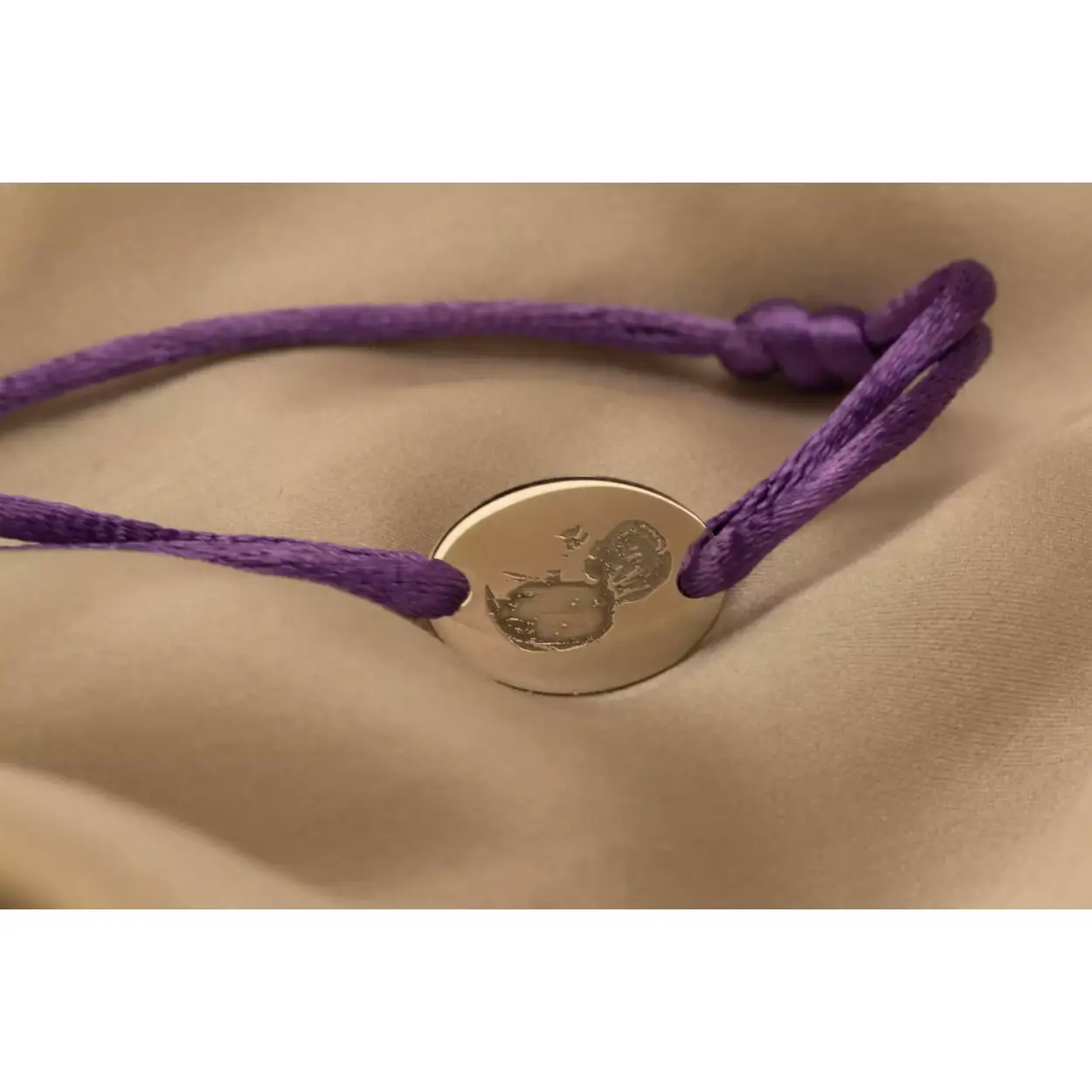 Satijn/ Zilveren armband met zilveren oval disk. Op deze disk is een laser gravure mogelijk.  Kleuren van de satijnen bandjes staan op de foto. Of u een geboorte, graveer plaatje of een gedenk sieraad wil, vraag naar de mogelijkheden.