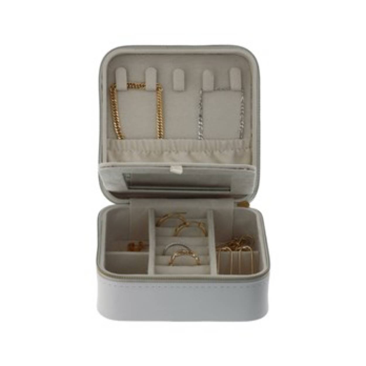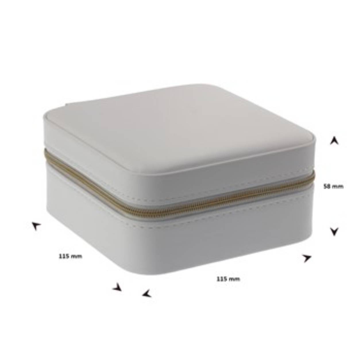 Luxe sieradenbox in de kleur wit uitgevoerd met een goudkleurige rits sluiting, een klein spiegeltje, verschillende vakjes en een extra vakje achter het spiegeltje. Een compacte box om verschillende sieraden in op te bergen.