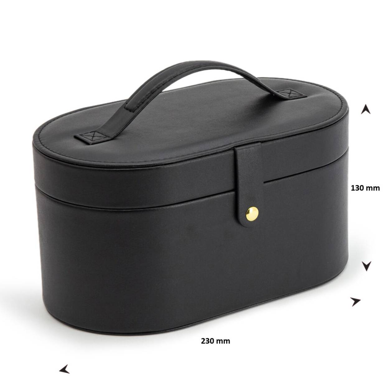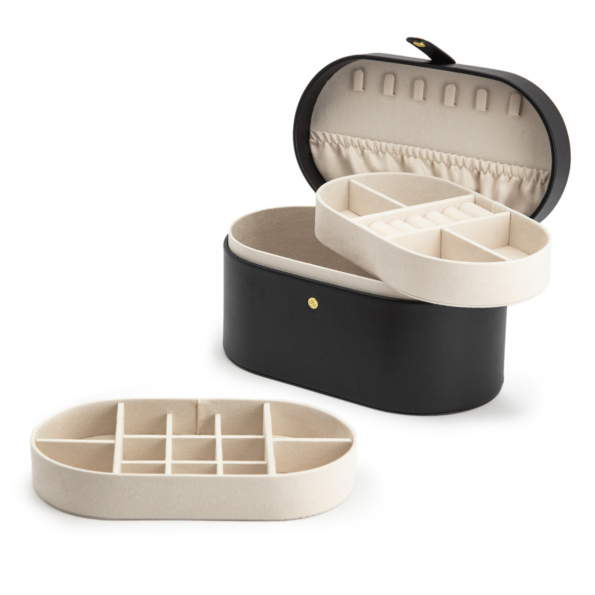 Luxe sieradenbox in de kleur zwart uitgevoerd met twee uitneembare trays en verschillende vakjes. Een compacte box om verschillende sieraden in op te bergen. In meerdere kleuren beschikbaar.
