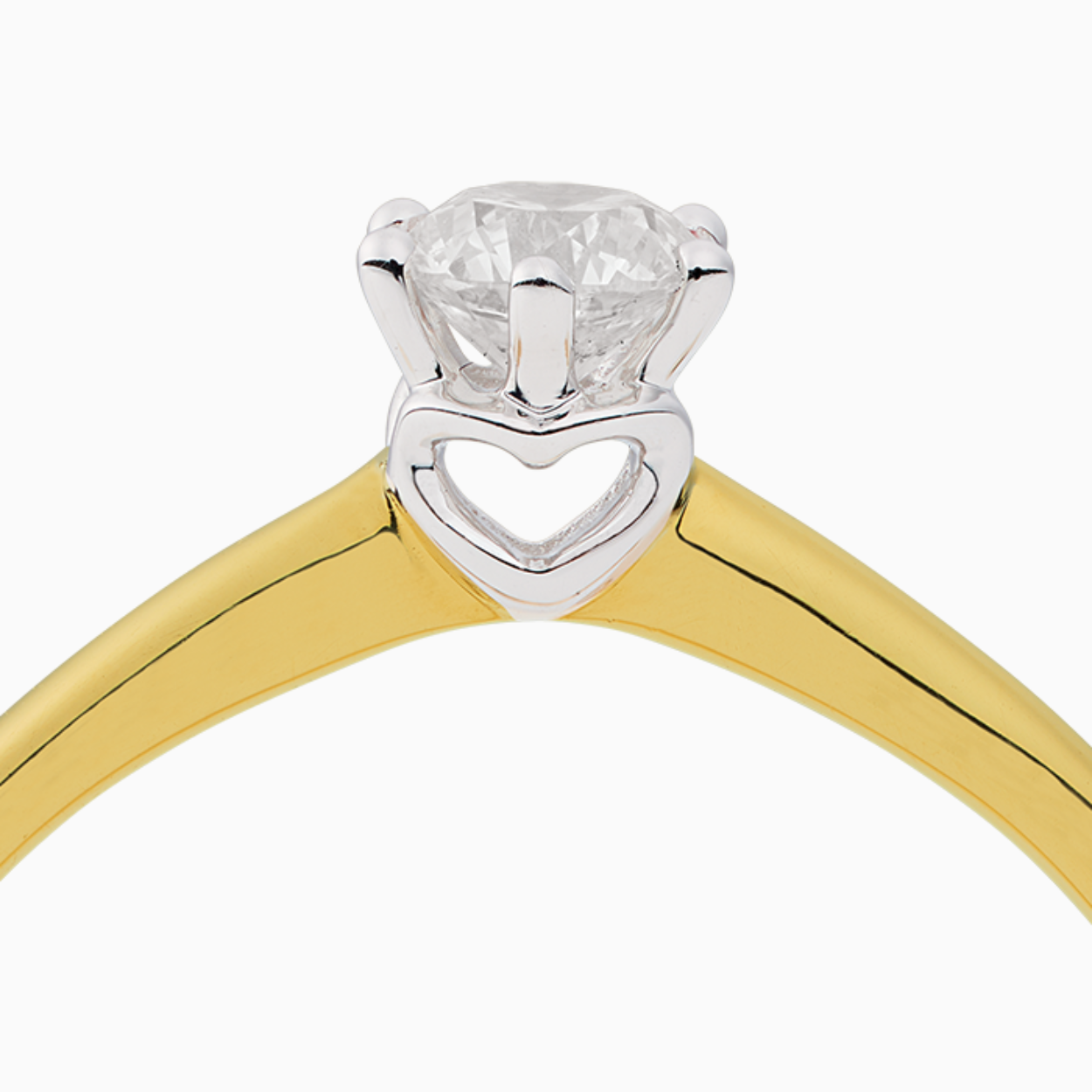 De Solitaire Ring R2022-1. Kenmerkend voor deze ring is het hartje in de zijkant van het chaton.  14 karaat goud met briljant geslepen diamant. Diamant kwaliteit Top Wesselton.