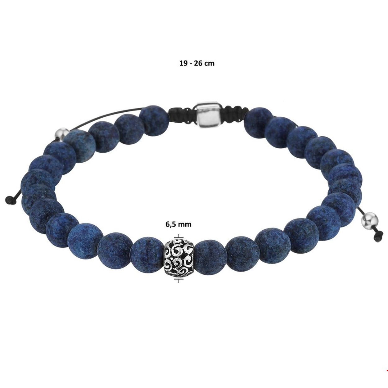Stoere armband uitgevoerd met mat afgewerkte lapis stenen en zilveren elementen. De armband heeft een breedte van 6.5mm en een draaglengte van 19 tot 26cm. Tip: Leuk om kado te geven! Of om te combineren met andere armbanden.