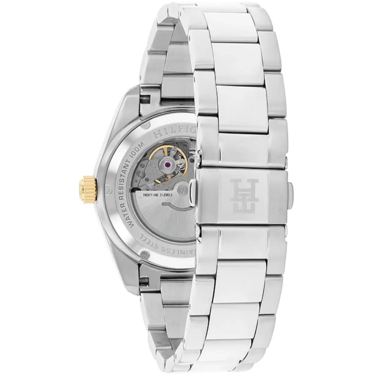 De TOMMY HILFIGER TH1710551 heeft een analoge tijdsaanduiding en een automatisch uurwerk en laadt op door de beweging van de pols.t. Het stalen herenhorloge heeft een ronde zilverkleurige kast met een blauw/rode bezel en een zilver/witte wijzerplaat met lumibrite strepen, goudkleurige wijzers als uursaanduiding en een datum.