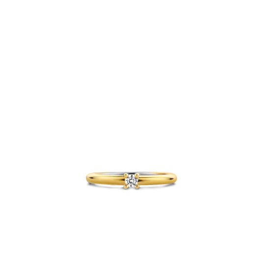 De witte zirkonia van deze zilveren TI SENTO solitaire ring 12211ZY wordt stevig vastgehouden door haar verfijnde pootjes. De fijne band is verguld volgens de standaarden van een goudsmid. Een klassiek stuk met een gouden uitstraling.
