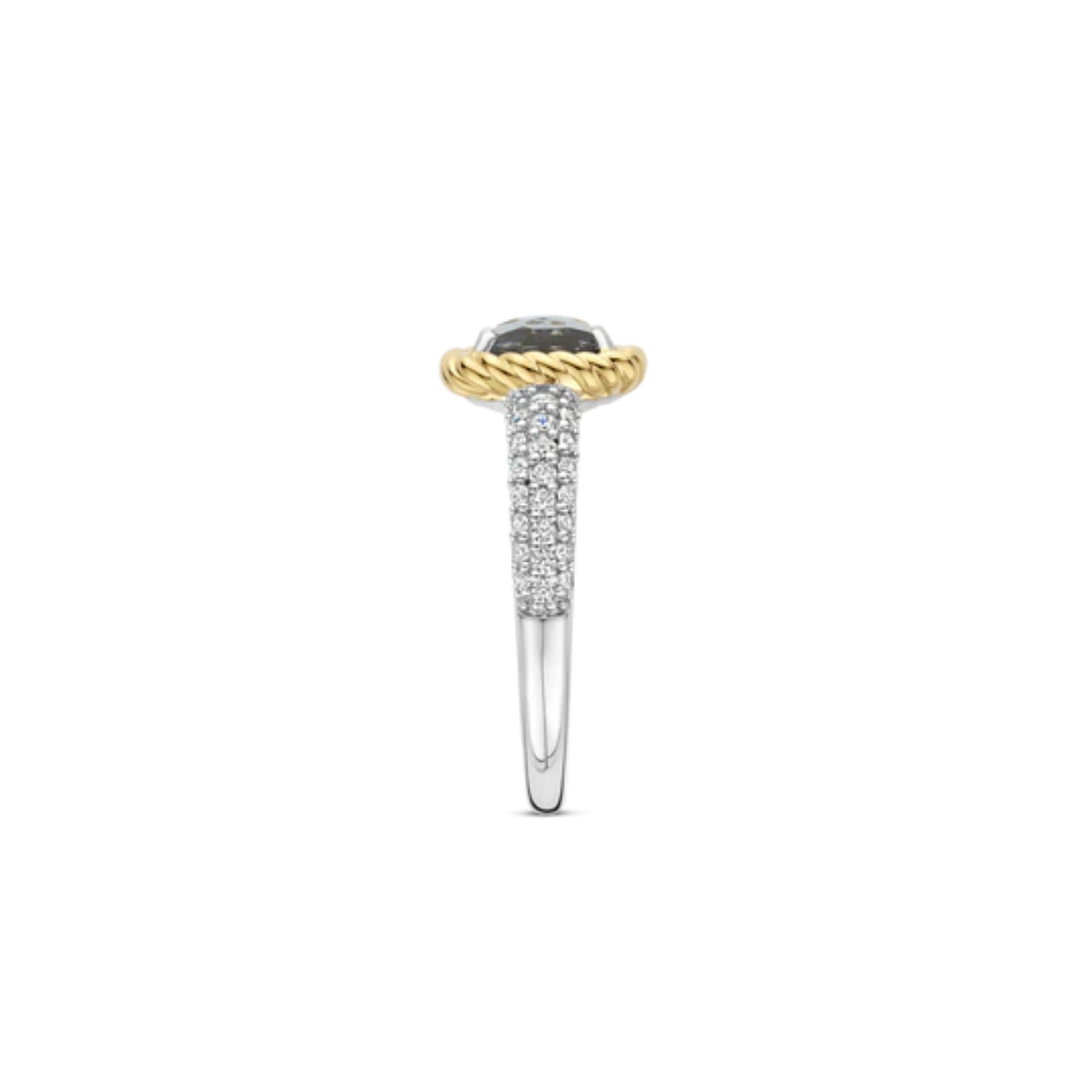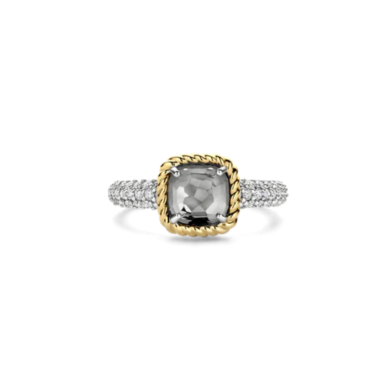 Omarm tonale elegantie met deze TI SENTO vergulde ring 12399GG. Vervaardigd uit 925 sterling zilver toont dit kussenvormige ontwerp een transparante grijze steen, fijn gefacetteerd en omlijst door een gedraaide goudkleurige klauwzetting. De platinakleurig vergulde band is pavé gezet met briljant geslepen witte zirconia en voegt een zachte fonkeling toe die de mysterieuze diepte van de steen versterkt. Elegant in zijn eenvoud verenigt deze ring vintage charme met moderne veelzijdigheid, perfect om alleen te dragen of als onderdeel van een zorgvuldig samengestelde ringstack. Nikkelvrij en hypoallergeen, hij biedt blijvend comfort en moeiteloze verfijning.