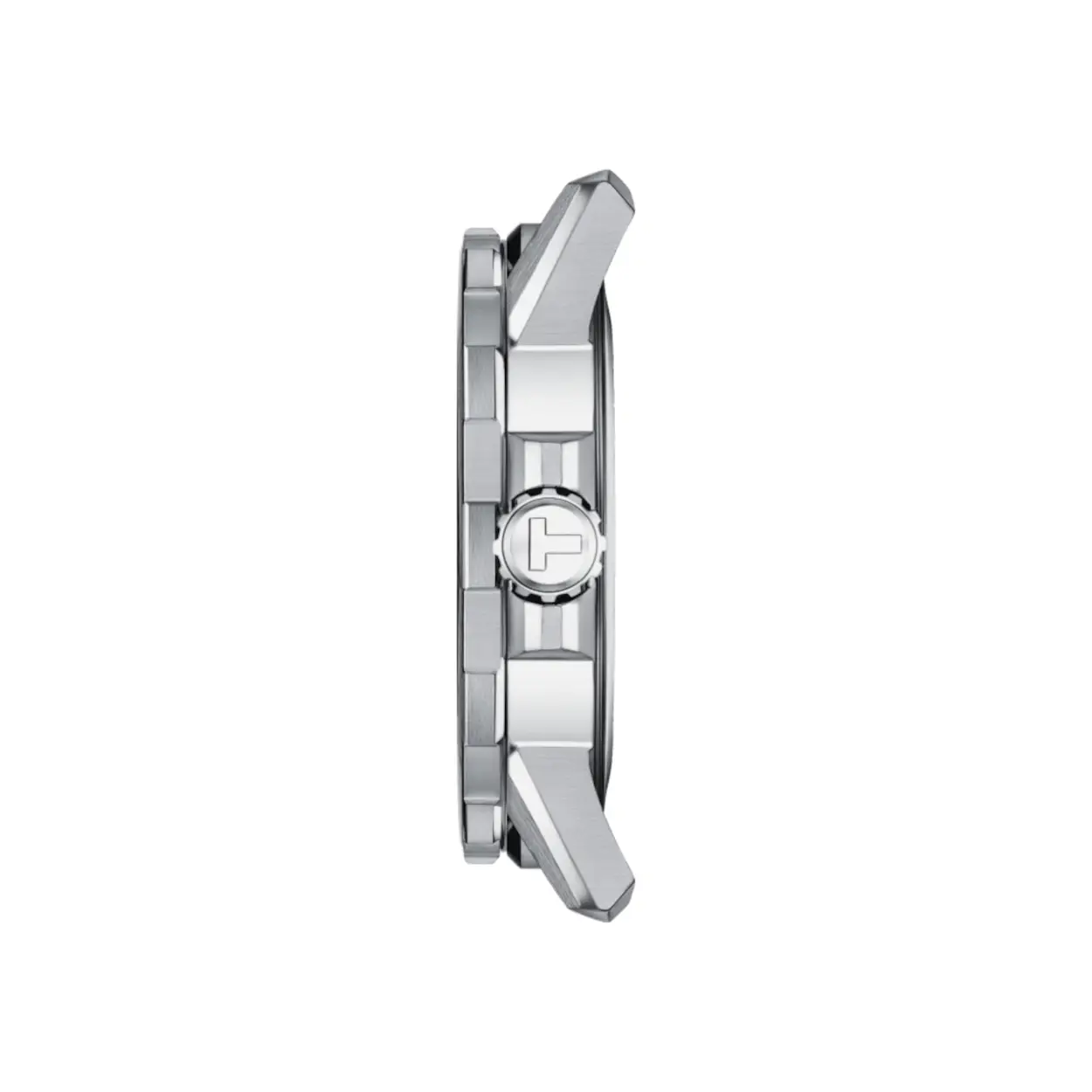 De Tissot Supersport-collectie is perfect voor de moderne man die zijn horloge in het dagelijks leven, formeel en informeel wil dragen. De duidelijke lijnen en strakke randen in combinatie met de 44mm kast geven de Tissot Supersport een sterke persoonlijkheid. De massieve indexen met SuperLuminova®-coating, die contrasteren met de wijzerplaat, zorgen voor een krachtig 3D-effect, een dynamische uitstraling en maken een indrukwekkende leesbaarheid in het donker mogelijk. Alle Tissot Supersport-modellen hebben een solide 316L roestvrijstalen kast, krasbestendig saffierglas en zijn waterbestendig tot een druk van 10 bar (100 meter / 330 voet). Deze versie van de Tissot Supersport heeft een nauwkeurig Zwitsers quartz uurwerk en de zwarte wijzerplaat heeft grote indexen en een datumaanduiding. De massieve 316L roestvrijstalen armband is uitgerust met een veiligheidsvouwsluiting en duikerverlenging.