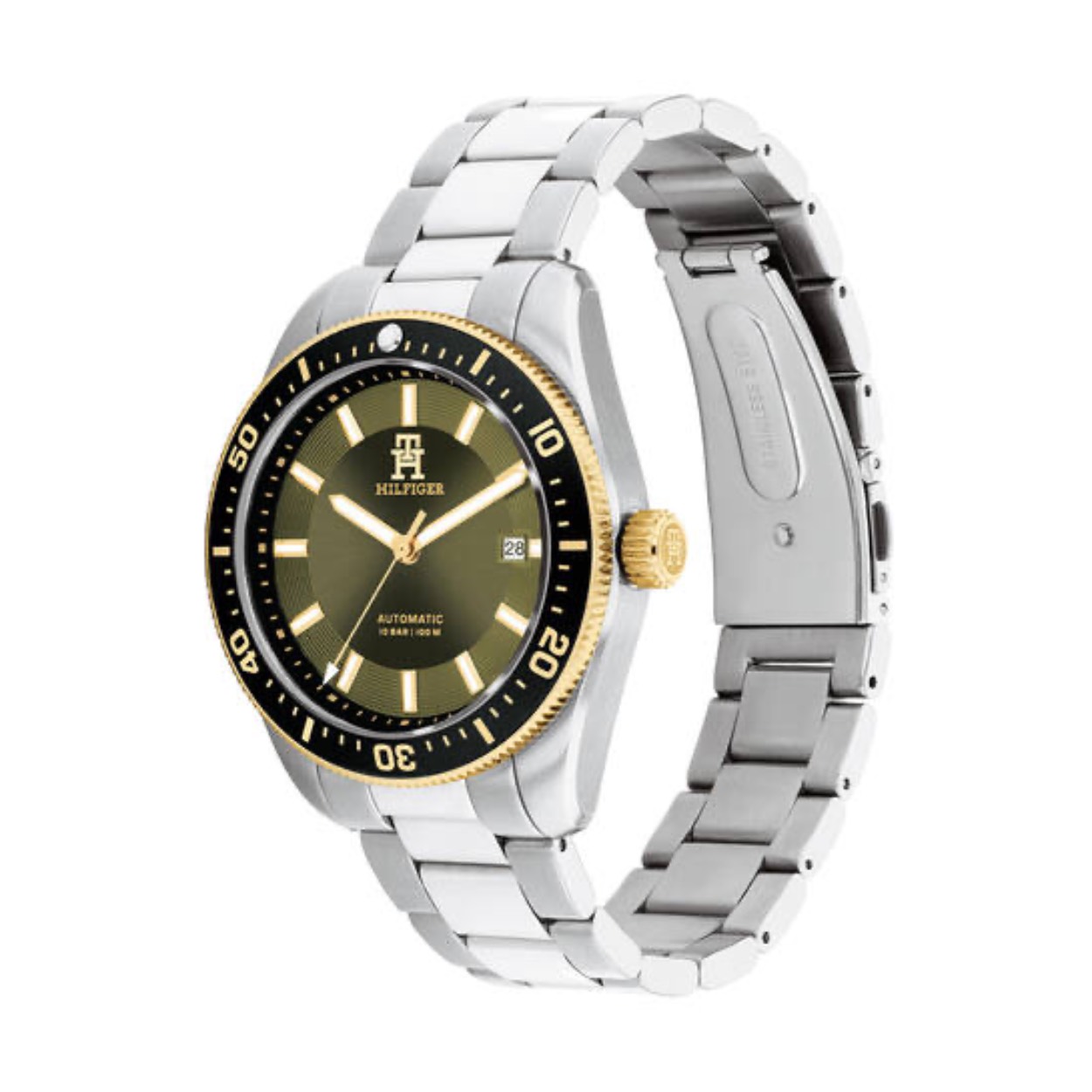 Dit specifieke horloge van Tommy Hilfiger uit de TH85 serie met artikelnr: TH1792155 is een luxe herenhorloge die niet in je collectie mag ontbreken. Het stalen herenhorloge heeft een ronde zilverkleurige kast met een zwarte bezel en een groene wijzerplaat met lumibrite strepen, goudkleurige wijzers als uursaanduiding en een datum. Het uurwerk is automatisch en laadt op door de beweging van de pols. De zilverkleurige schakelband is op lengte verstelbaar en heeft een vouwsluiting. Door een glas aan de achterkant van het horloge is het uurwerk zichtbaar. Het horloge heeft een mineraalglas, een doorsnee van 40mm en is 10ATM.