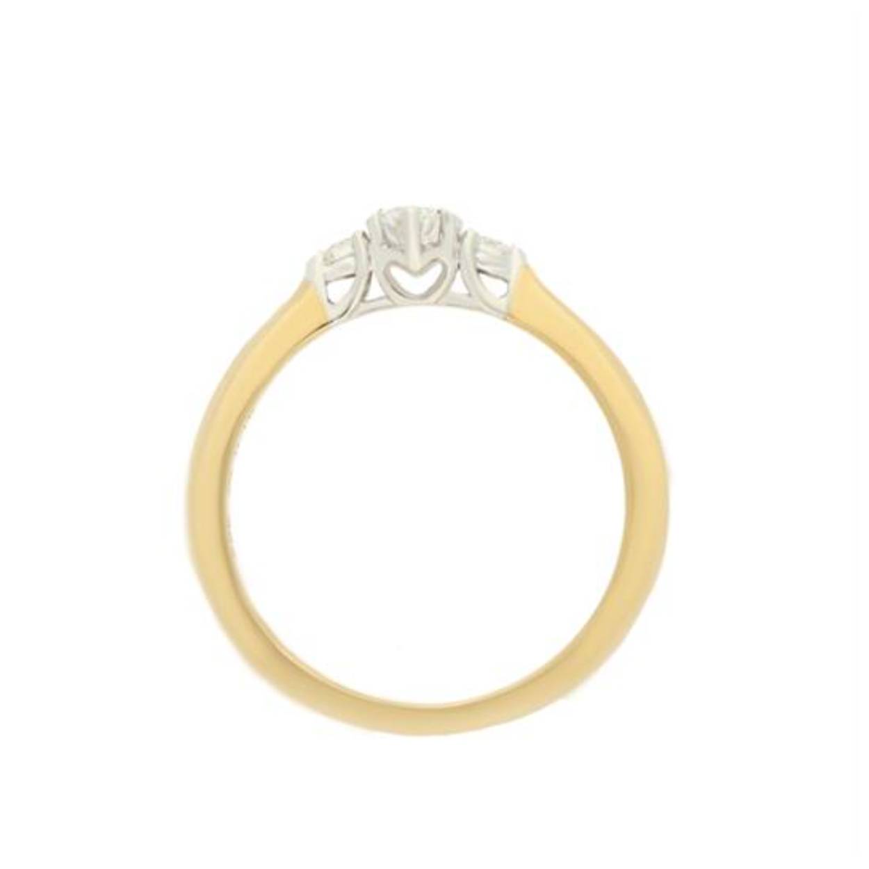 Huiscollectie 14krt bi-color gouden  ring met diamant 0,14crt GSI. Deze fantasie ring heeft drie diamanten. De diamanten zijn gezet in zespoots chaton zettingen. Vanaf de zijkant is een hart zichtbaar. Een prachtige aanzoeksring.