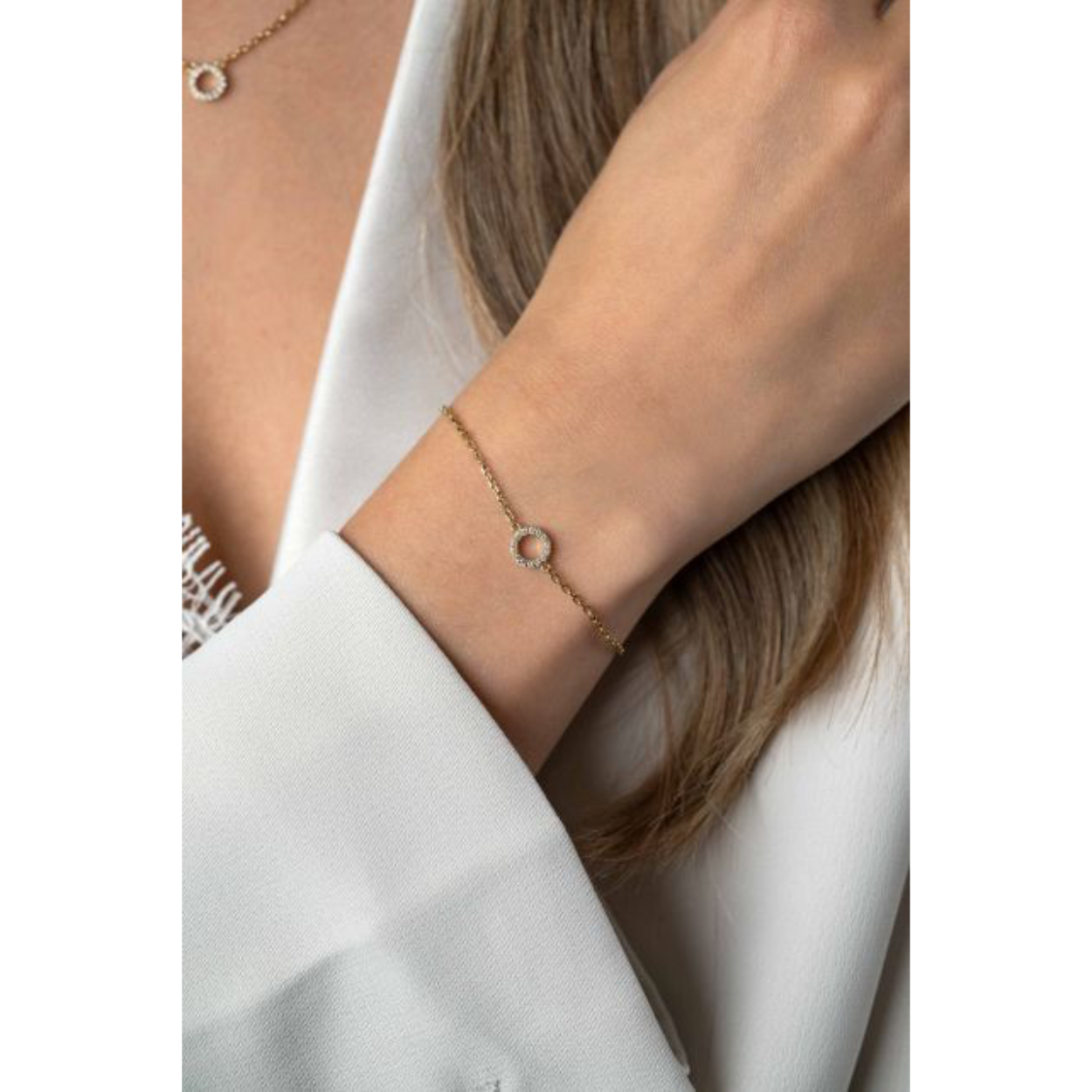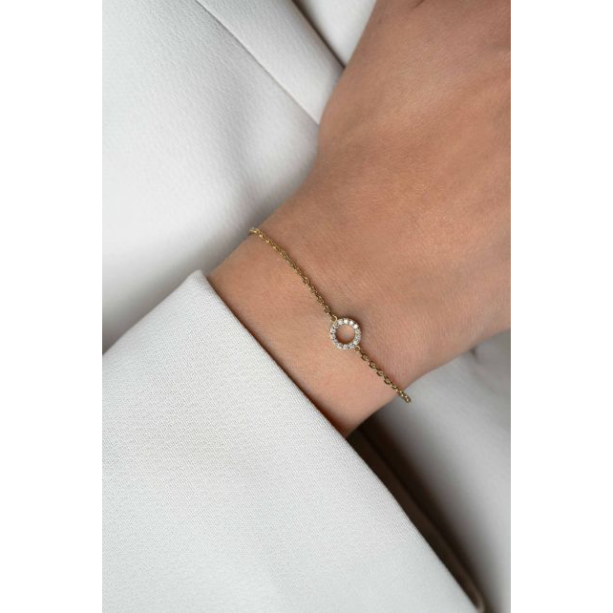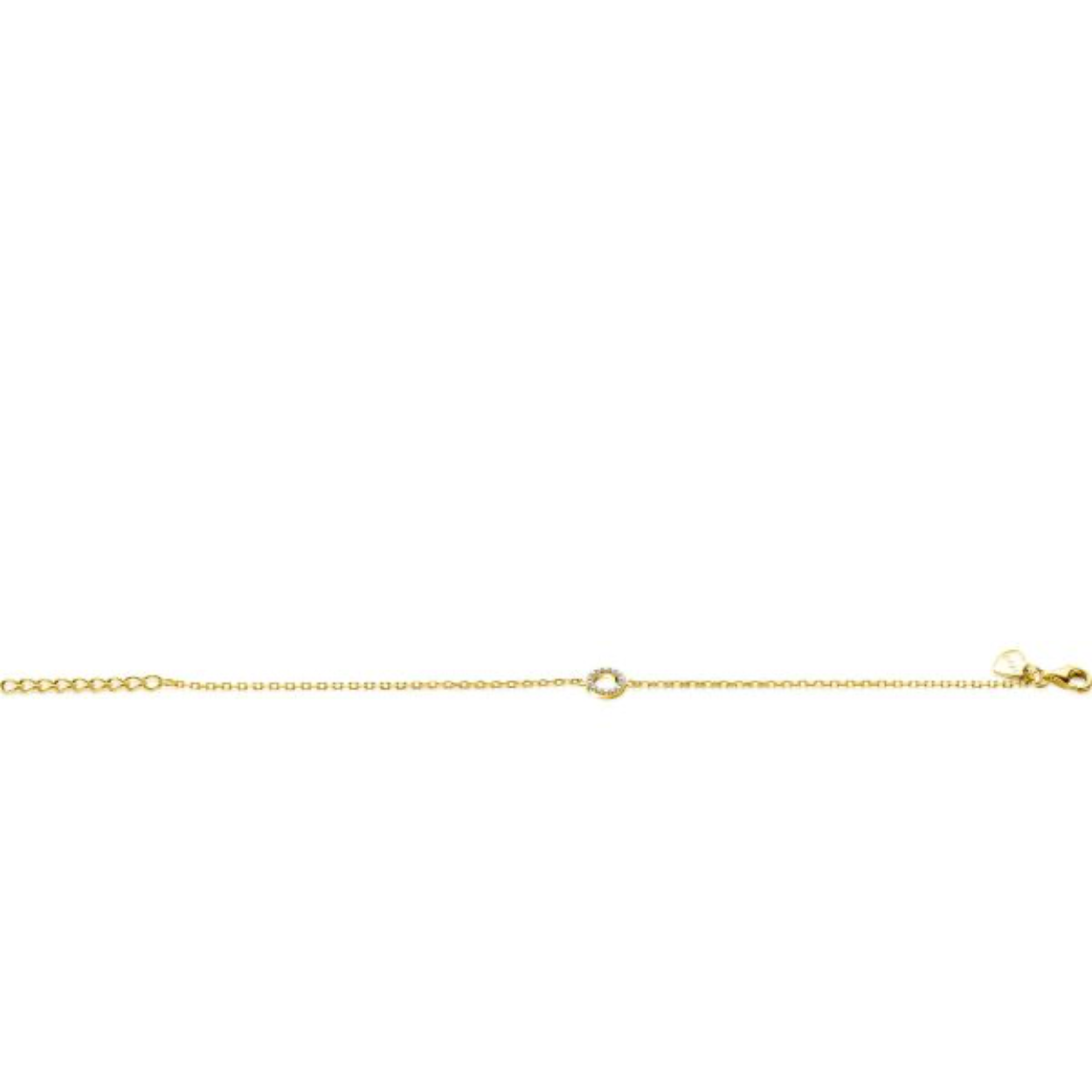 Zinzi gold plated zilveren armband met subtiele paperclip schakel en open rondje (7,5mm). Het rondje in het midden van de armband is mooi bezet met witte zirconia's. Een sierlijke armband die ook goed te combineren is met andere zilveren armbanden. Met herkenbaar Zinzi hartje bij de sluiting. De lengte is te variëren tussen 16,5 en 19,5 cm. De armband is vervaardigd van eerste gehalte zilver (925) en extra geel verguld.