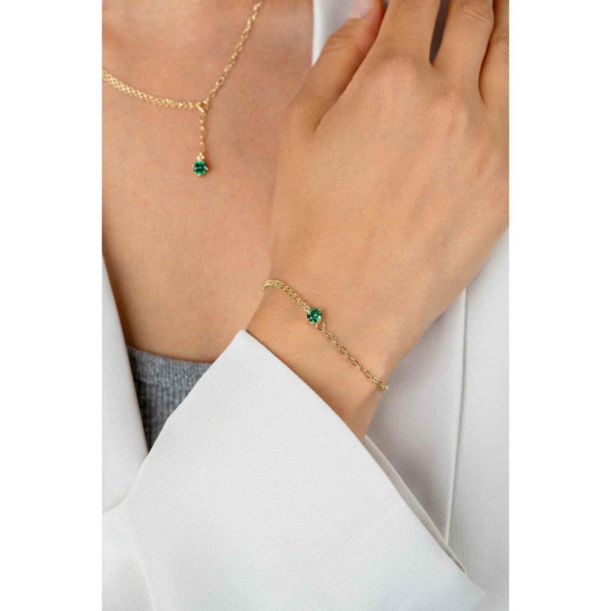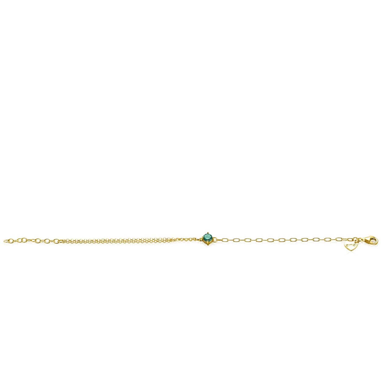 Zinzi gold plated zilveren multi-look armband met een subtiele dubbele jasseron schakel aan de één zijde en aan de andere kant een enkele ovale schakel. Tussen de twee schakels zit een ronde groene kleursteen in een vierpootszetting. Combineer de armband met de bijpassende kettingen en oorknoppen voor een chique uitstraling. De lengte van de armband is te variëren tussen 17cm en 19cm. Vervaardigd van eerste gehalte zilver (925) en extra geel verguld.