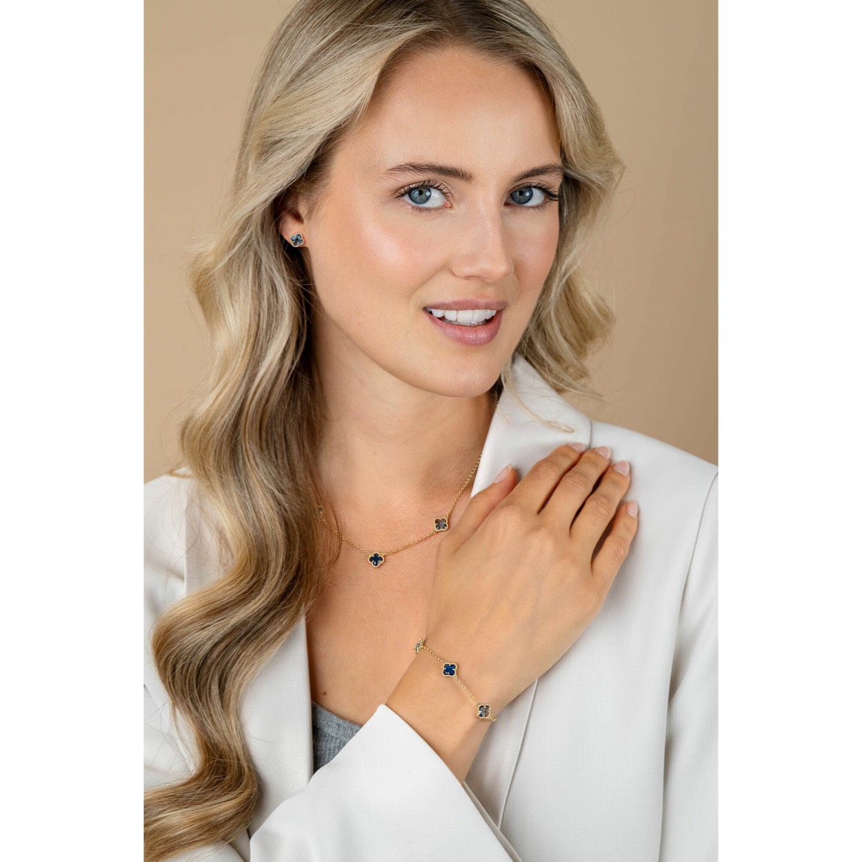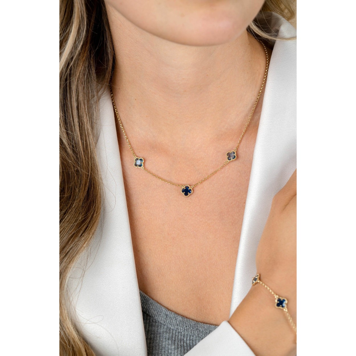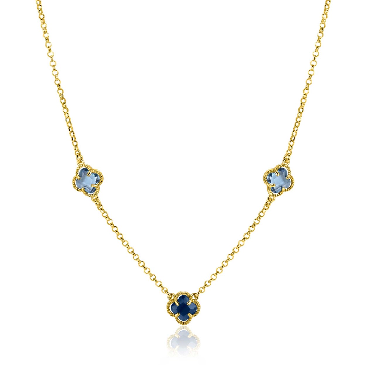 ZINZI gold plated zilveren schakelketting met twee lichtblauwe klavers en een donkerblauwe klaver in het midden, gelijkmatig verdeeld over de ketting. De lengte is te variëren tussen 42cm en 45cm. De ketting is vervaardigd van eerste gehalte zilver (925) en extra geel verguld.