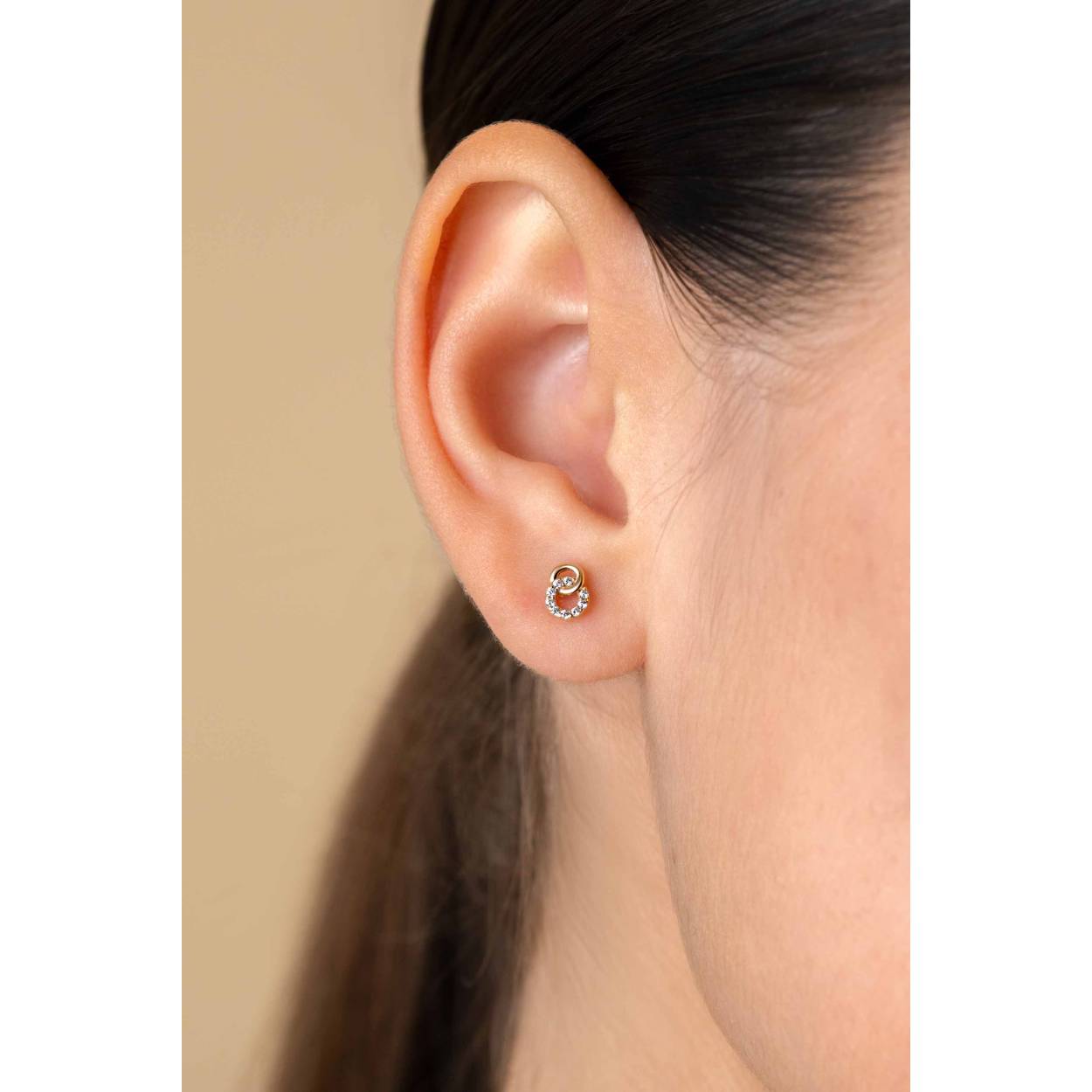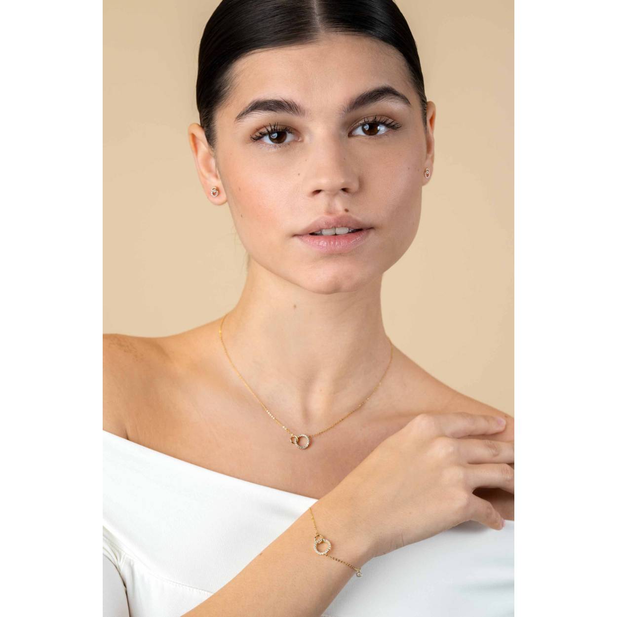 ZINZI Gold 14 krt gouden oorknoppen waarbij twee open rondjes mooi met elkaar verbonden zijn: een glad open rondje en een groter open rondje bezet met witte zirconia's. De oorsieraden zijn 6,5mm lang. Vervaardigd van geheel 14 karaat goud (585).