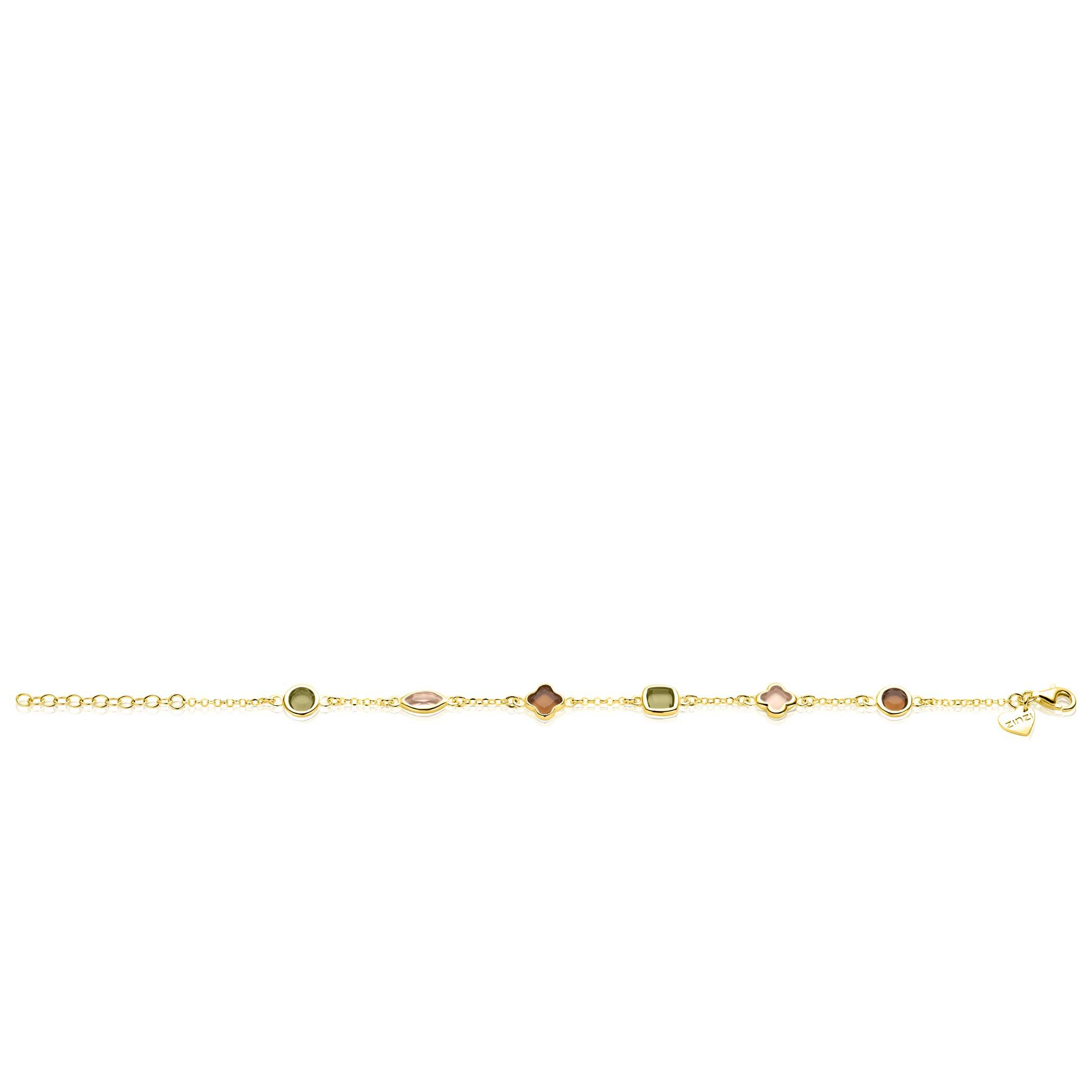Zinzi gold plated zilveren armband met speelse vormen, bezet met bruine en olijfgroene kleurstenen.Door de afwisseling van vormen en kleuren krijgt dit sieraad een moderne en stijlvolle uitstraling. De lengte is verstelbaar van 17cm tot 20cm. Vervaardigd van eerste gehalte zilver (925) en extra geel verguld.