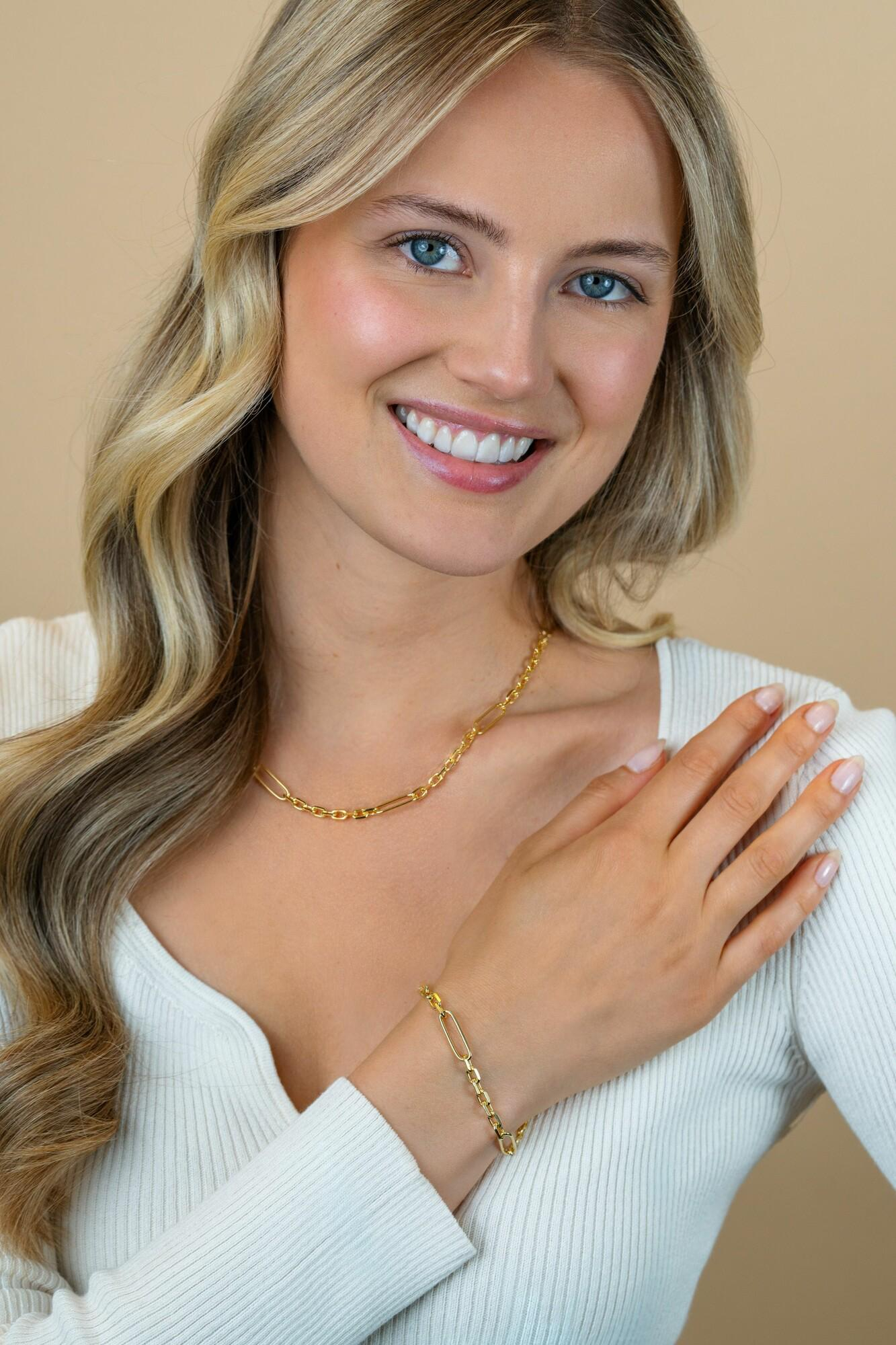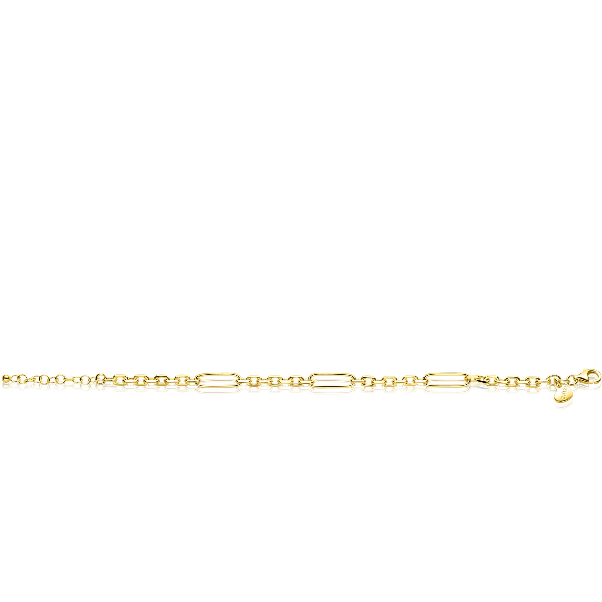 Zinzi gold plated zilveren schakelarmband met drie lange ovale schakels. De armband is 5,5mm breed en voorzien van een verlengkettinkje voor optimaal comfort (te variëren tussen 18 en 21cm). De armband is vervaardigd van eerste gehalte zilver (925) en extra geel verguld.