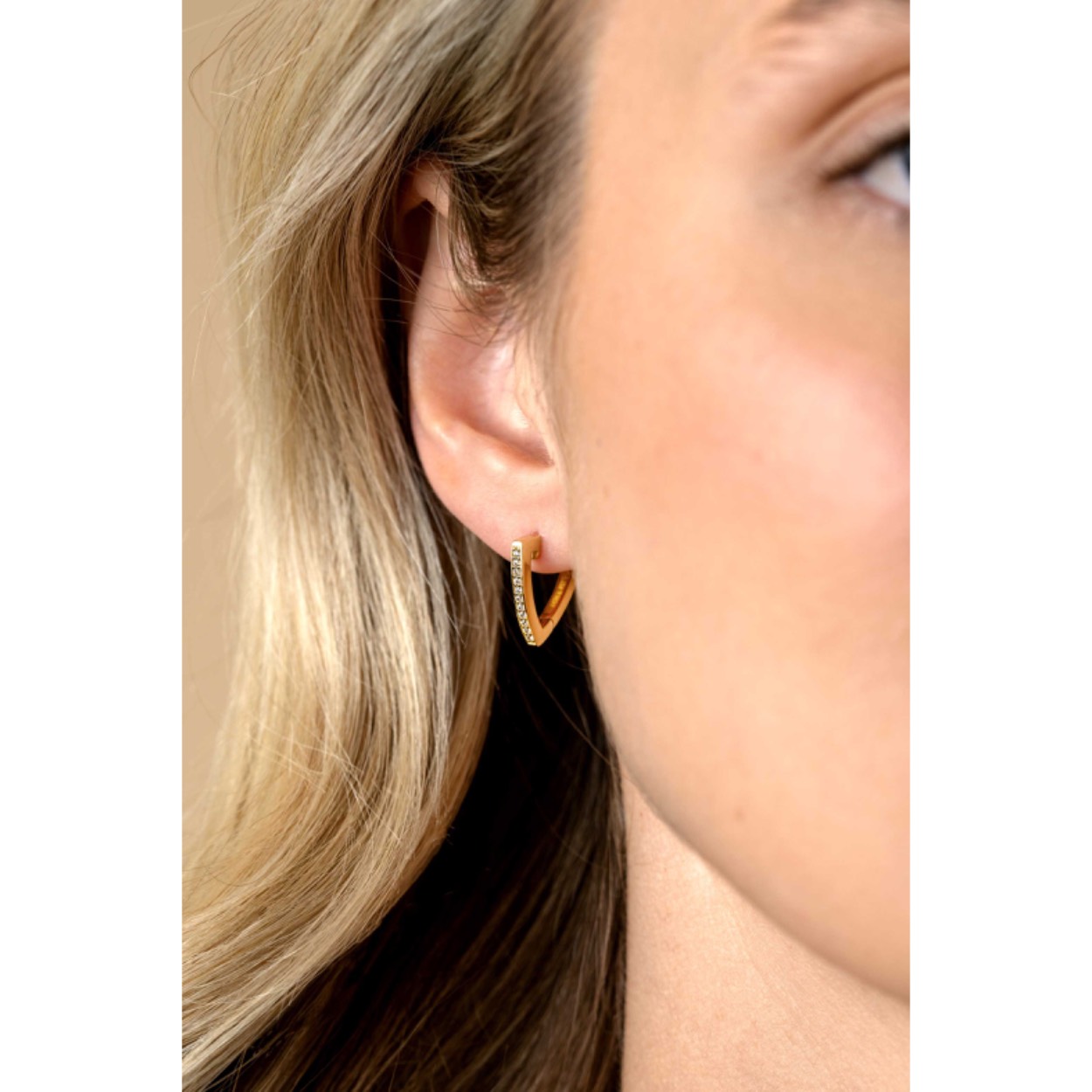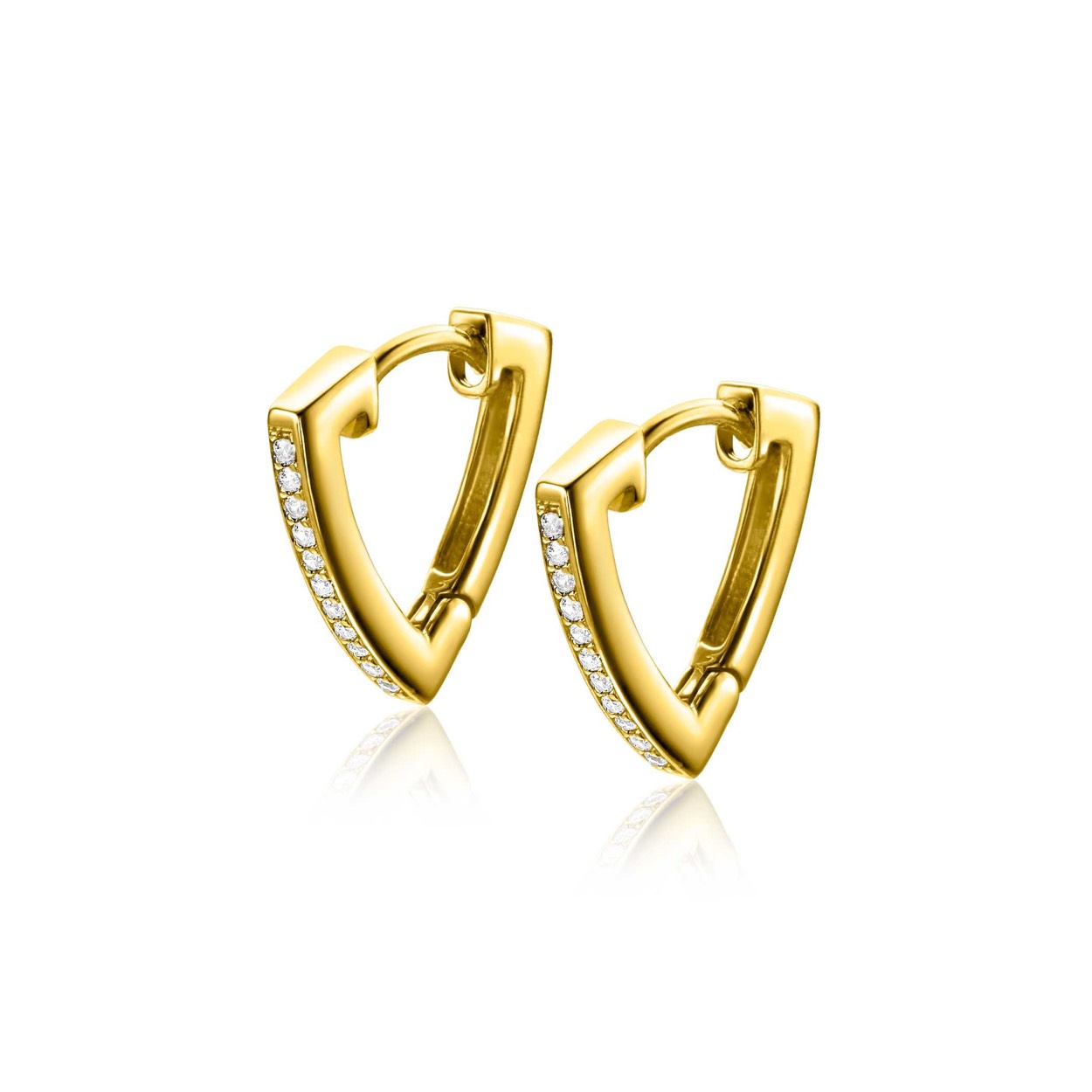 ZINZI gold plated zilveren oorringen (14x2mm) in trendy driehoeksvorm, waarbij de voorkant is bezet met witte zirconia's. Met luxe en gemakkelijke klapsluiting. De oorringen hangen als een driehoek of V-teken om je oorlel. Deze oorringen zijn te combineren met al onze oorbedels. De oorsieraden zijn vervaardigd van eerste gehalte zilver (925) en extra geel verguld.