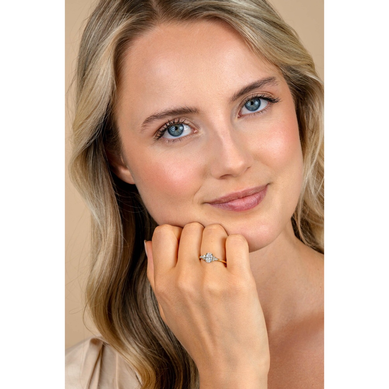 ZINZI gold plated zilveren ring met een grote ovale witte zirkonia (7mm) in vierpootszetting in het midden en kleinere witte zirkonia's in de scheen. Leuk detail: het kleine hartje aan de zijkant van de zetting. Vervaardigd van eerste gehalte zilver (925) en extra geel verguld.