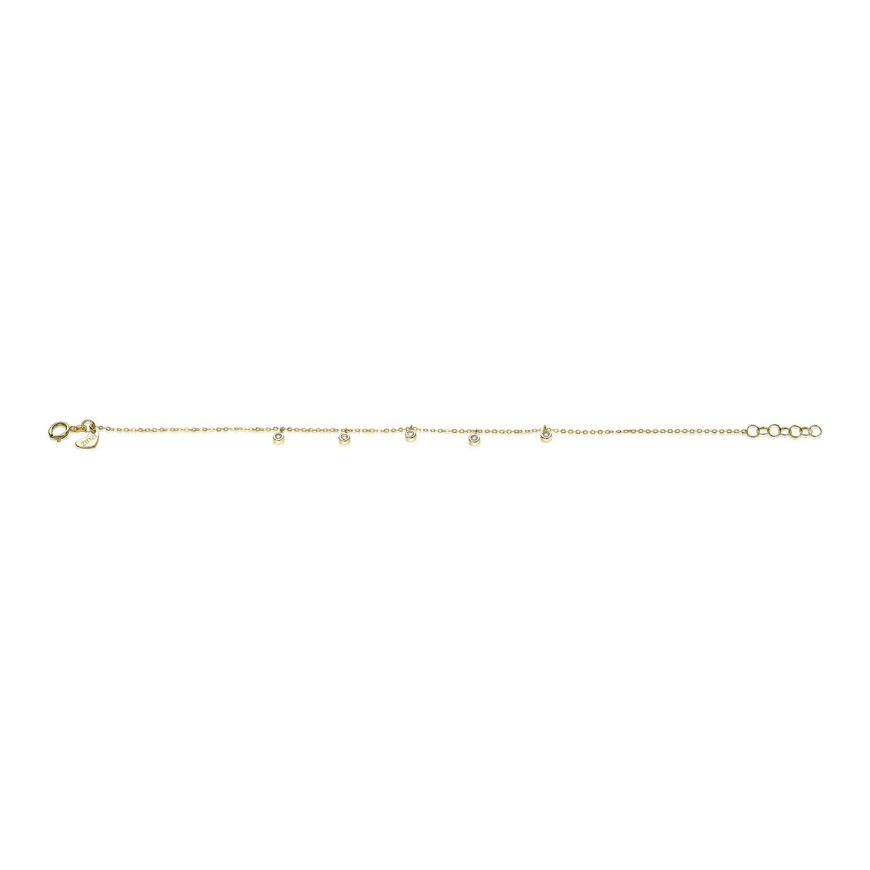 ZINZI Gold 14 karaat gouden armband met fijne jasseron schakel en vijf rond gezette witte zirconia hangertjes, gelijkmatig verdeeld over de gouden armband. Vervaardigd van geheel 14 karaat goud (585). En herkenbaar ‘Zinzi’ door het kleine gouden Zinzi hartje bij de sluitin