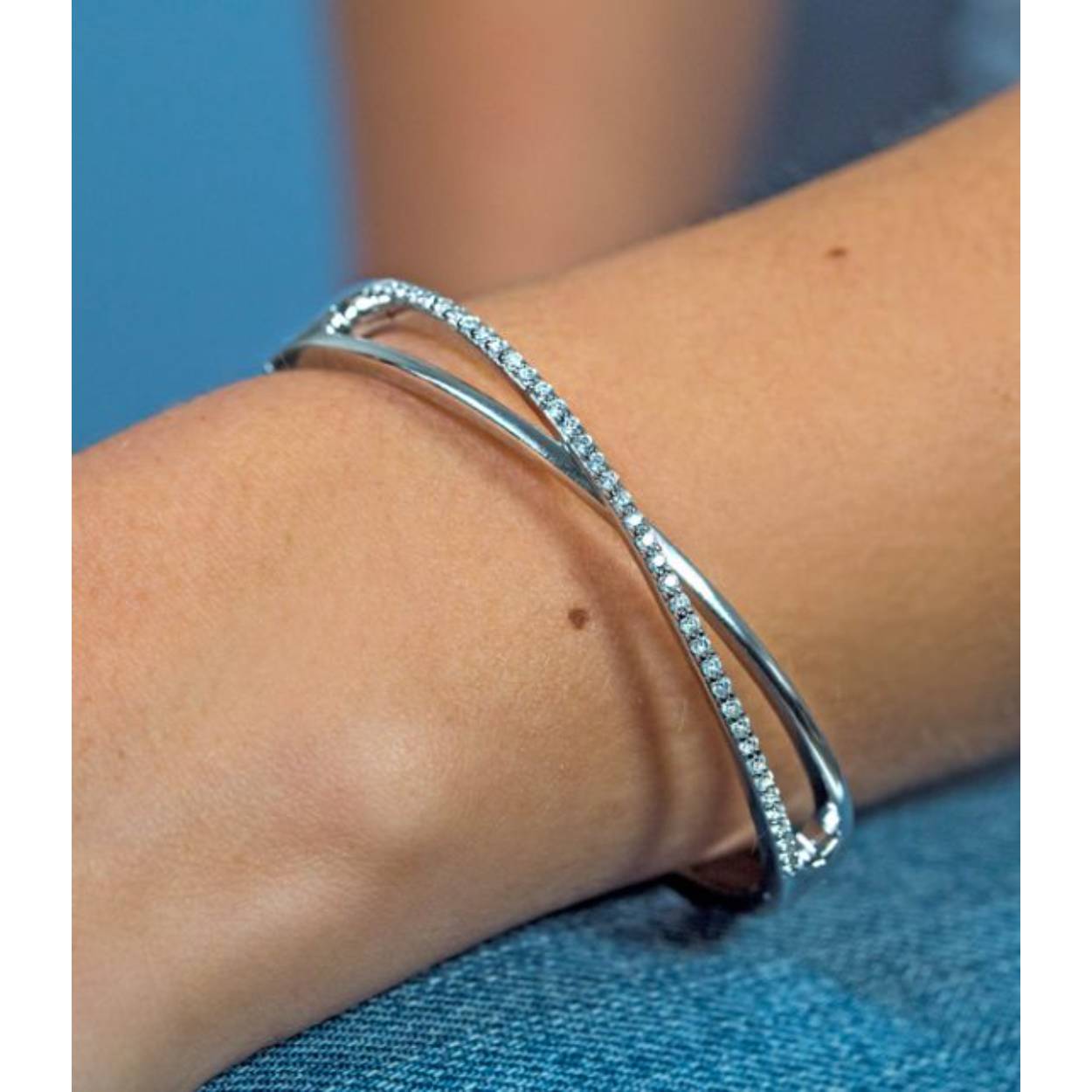 ZINZI zilveren cross-over slavenarmband, waarbij een gladde band en een band bezet met witte zirconia's elkaar kruisen. Met exclusieve scharniersluiting. De armband is vervaardigd van eerste gehalte zilver (925) en voorzien van een extra rodiumlaag voor een langdurige glans. Draag de armband met de bijpassende ring en oorringen.