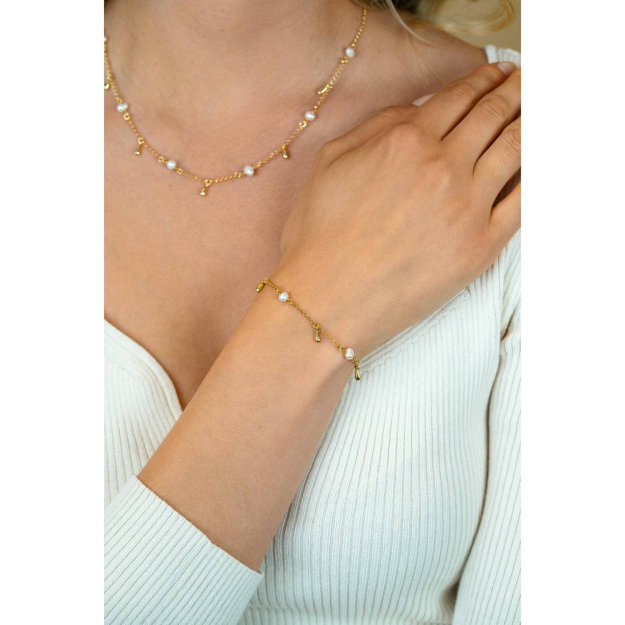 ZINZI gold plated zilveren armband met kleine witte zoetwaterpareltjes en druppelvormige hangertjes. Gemakkelijk verstelbaar door het verlengkettinkje 17-20cm. De armband is vervaardigd van eerste gehalte zilver (925) en extra geel verguld.
