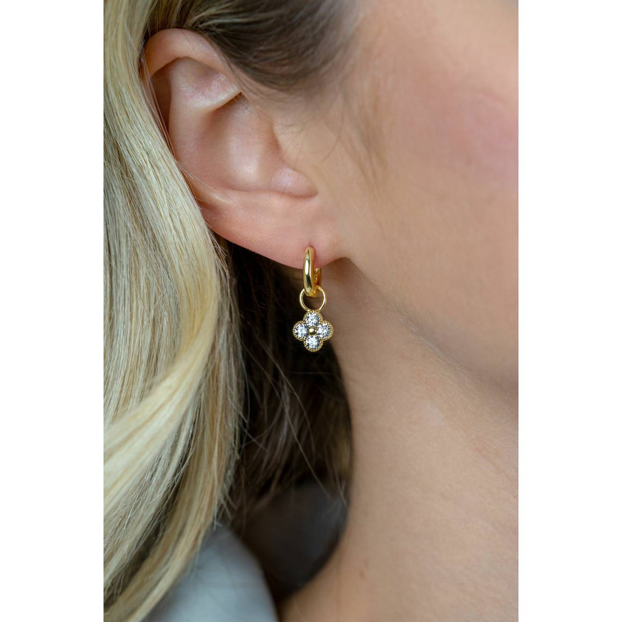 ZINZI gold plated zilveren oorbedels met klavers, bezet met witte zirkonia's. De klavers zijn 8mm groot. De oorbedels zijn vervaardigd van eerste gehalte zilver (925) en extra geel verguld. Oorbedels zijn zonder oorringen geprijsd.