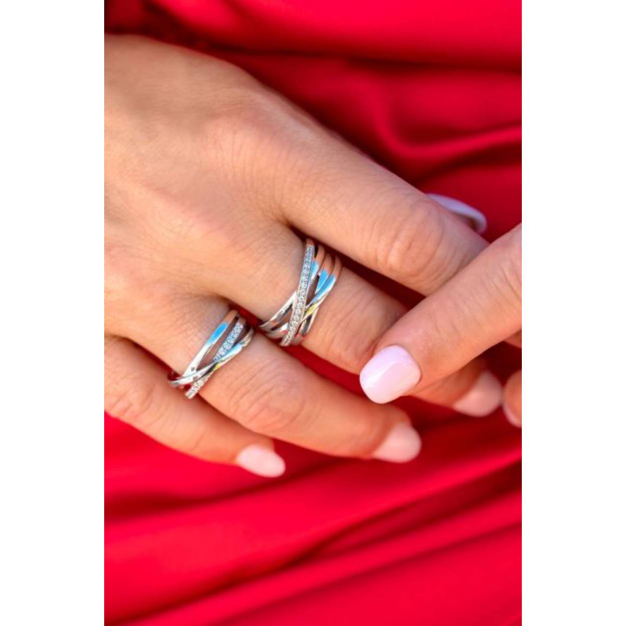 ZINZI zilveren brede cross-over ring, waarbij drie gladde banden en een band bezet met witte zirconia's elkaar kruisen. De ring is vervaardigd van eerste gehalte zilver (925) en voorzien van een extra rodium laag voor een langdurige glans.