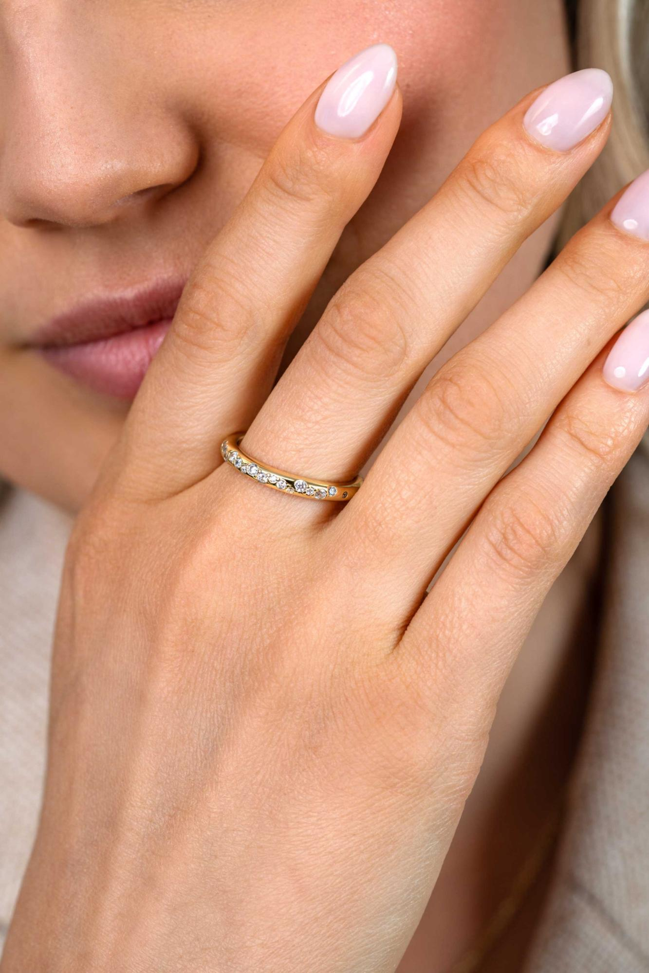 ZINZI gold plated zilveren rijring (3mm breed) met witte zirkonia’s als druppels verwerkt