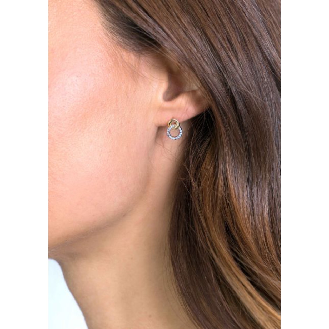 ZINZI zilveren oorknoppen met twee verbonden open rondjes, waarvan de bovenste extra geel verguld is en de onderste iets groter is en bezet is met witte zirconia's. Deze oorknoppen zijn stijlvol en elegant bij elke outfit! Vervaardigd van eerste gehalte zilver (925) en extra 14K geel verguld. Maak je set compleet met de bijpassende ring, armband of ketting.