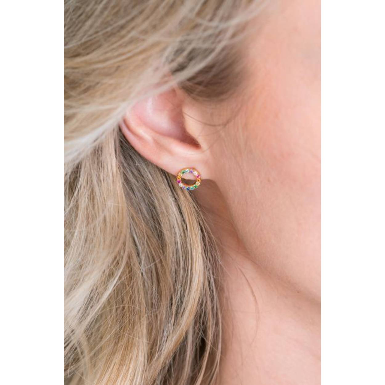 ZINZI zilveren oorknoppen 8mm in ronde vorm bezet met een regenboog aan kleurstenen. Deze subtiele maar schitterende oorsieraden geven elke outfit kleur! Maak je look compleet met de bijbehorende hanger en ring.  Vervaardigd van eerste gehalte zilver (925) en extra 14K geel verguld.