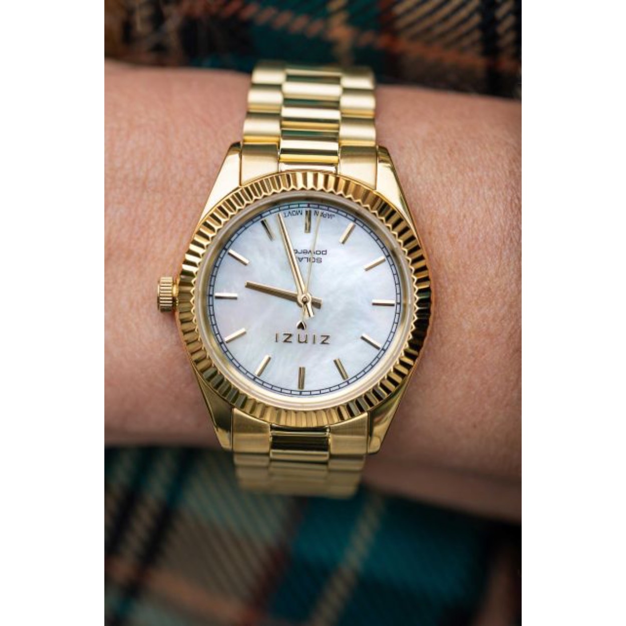 Het ZINZI Solaris horloge is trendy, klassiek en duurzaam tegelijk. Het Japanse kwaliteitsuurwerk maakt gebruik van licht als energiebron. De kleine zonnecellen vangen het zonlicht op, maar ook met kunstlicht kan dit horloge zich opladen, Het vervangen van de batterij is niet meer nodig. Met de mooie ring rondom de parelmoer wijzerplaat en de stoere rolex-style stalen band met luxe clip-sluiting, krijgt het horloge een stijlvolle stoere uitstraling. Voorzien van een witte parelmoer wijzerplaat, geelgoudkleurige stalen kast 35mm en stalen schakelband. Extra kwaliteit: Voorzien van een Citizen-Miyota uurwerk, sterk mineraal glas en het horloge is 5atm waterbestendig (tegen regen en spatwater).